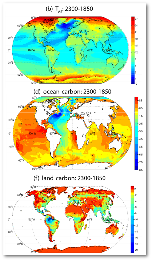 Changes in (b) surface air temperature, (d) ocean carbon storage, and (f) land carbon storage from 1850 to 2300 from the fully coupled simulation performed in this study. |